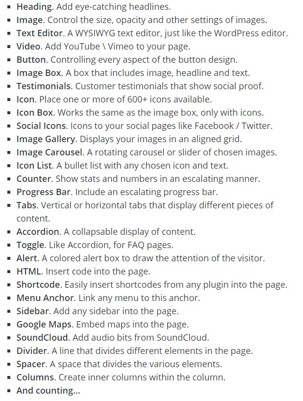 The free version of the Elementor comes with loads of widgets that you can drag and drop to design the page you want. There are more than 25 Elementor widgets that come with the free version of the plugin and more are expected to arrive.
